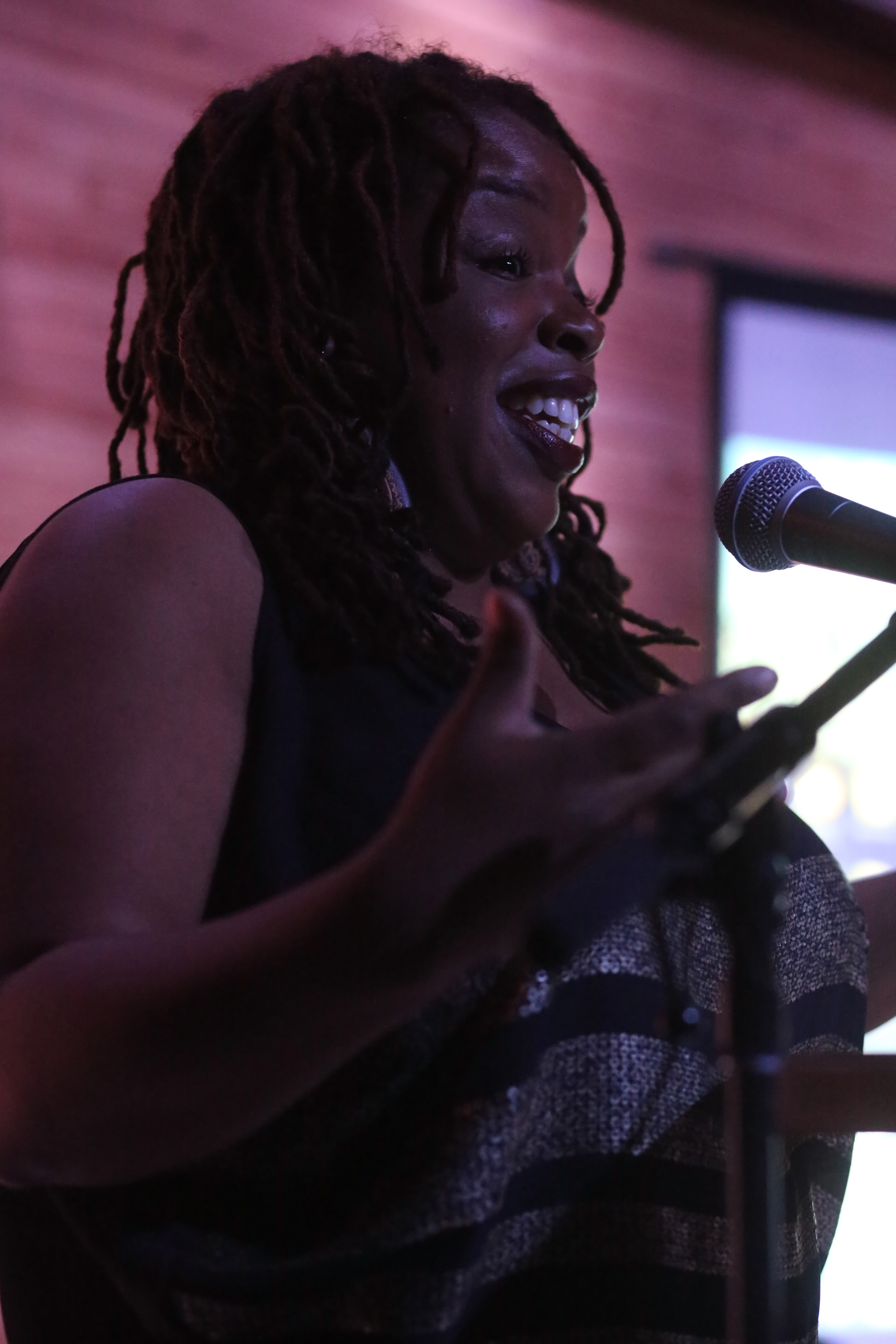 8/30/2016 Words for Terri Sue Published September 8, 2016 at 3840 × 5760 in Words for Terri Sue: Wrap-up and photos Kelly Harris on-stage with her poems like music. Photo by L. Kasimu Harris.