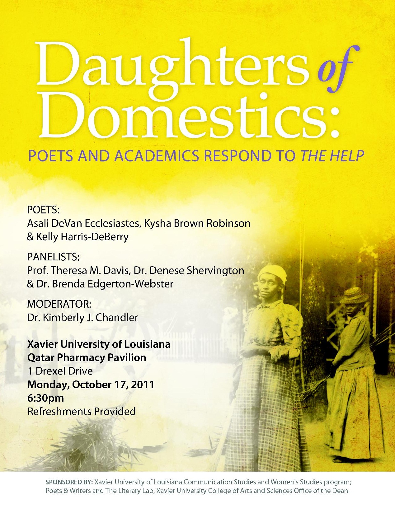 Another event that is drawing interest from beyond the universe of writers is “Daughters of Domestics: Poets & Academics Respond to ‘The Help’.” [tb:a response to “The Help” by poets and academics, on October 17 at 6:30 p.m. at the Xaview University Qatar Pharmacy Pavilion at 1 Drexel Drive].It started from a poem I was writing about my own mother, who at various times in the late 80s and 90s cleaned homes for white owners. My mother turned 60 this year and for some reason it made me go public in my poetry about my mother’s cleaning days. Five months later “The Help” was released in theatres.